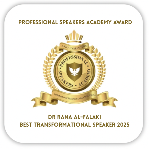 Honoured by the Professional Speakers Academy, Dr Rana Al-Falaki received the Best Transformational Speaker Award 2025, recognising her ability to inspire deep change through her signature blend of science, authenticity, and storytelling. Her message of optimal performance and wellbeing continues to energise audiences worldwide.